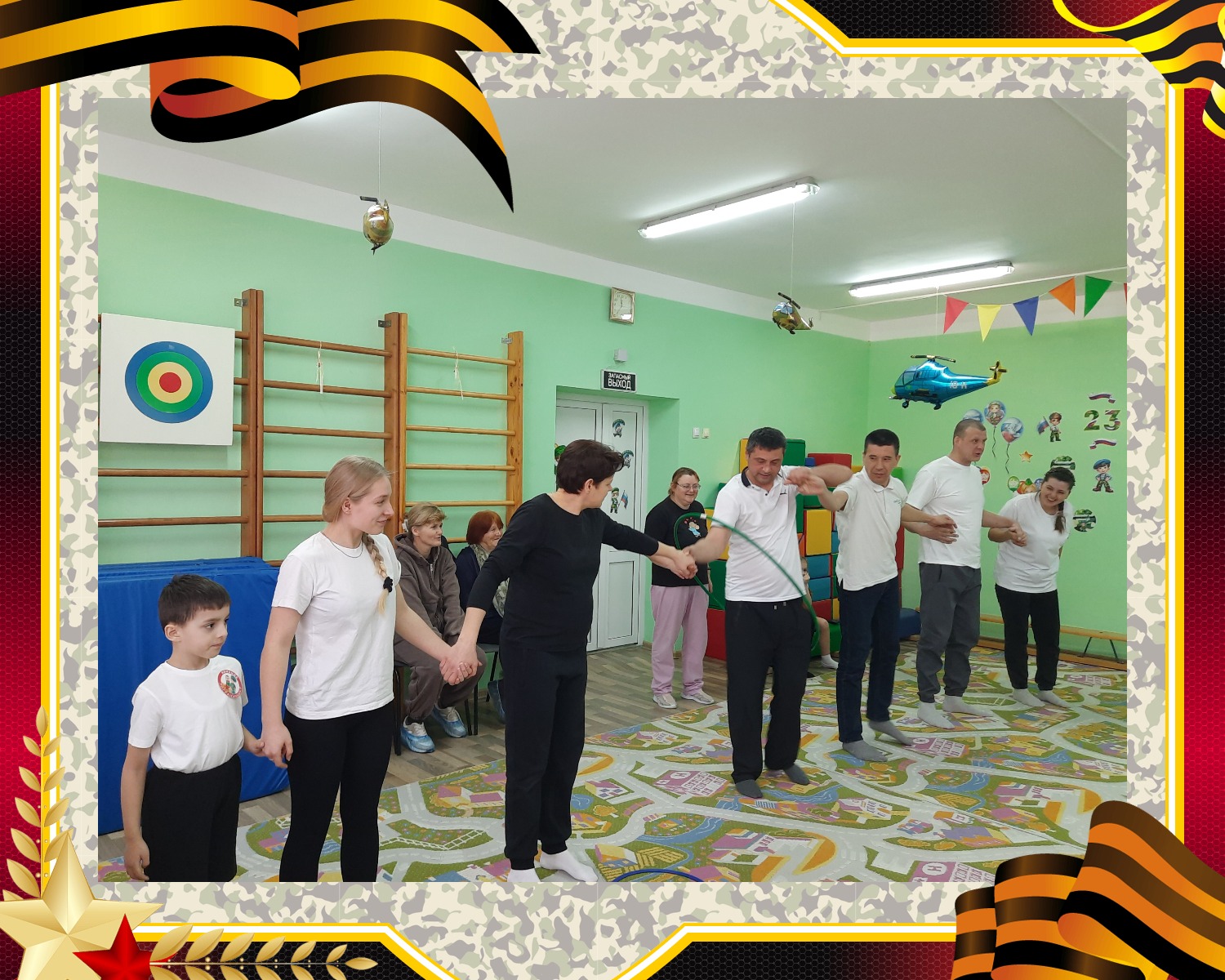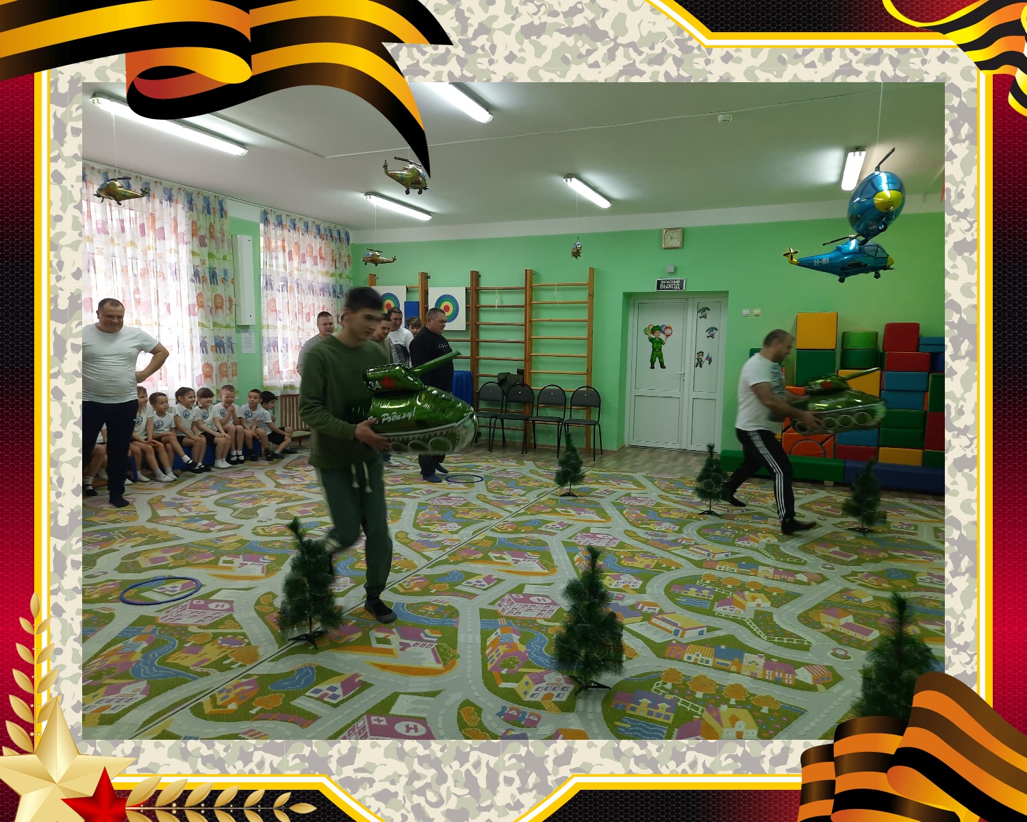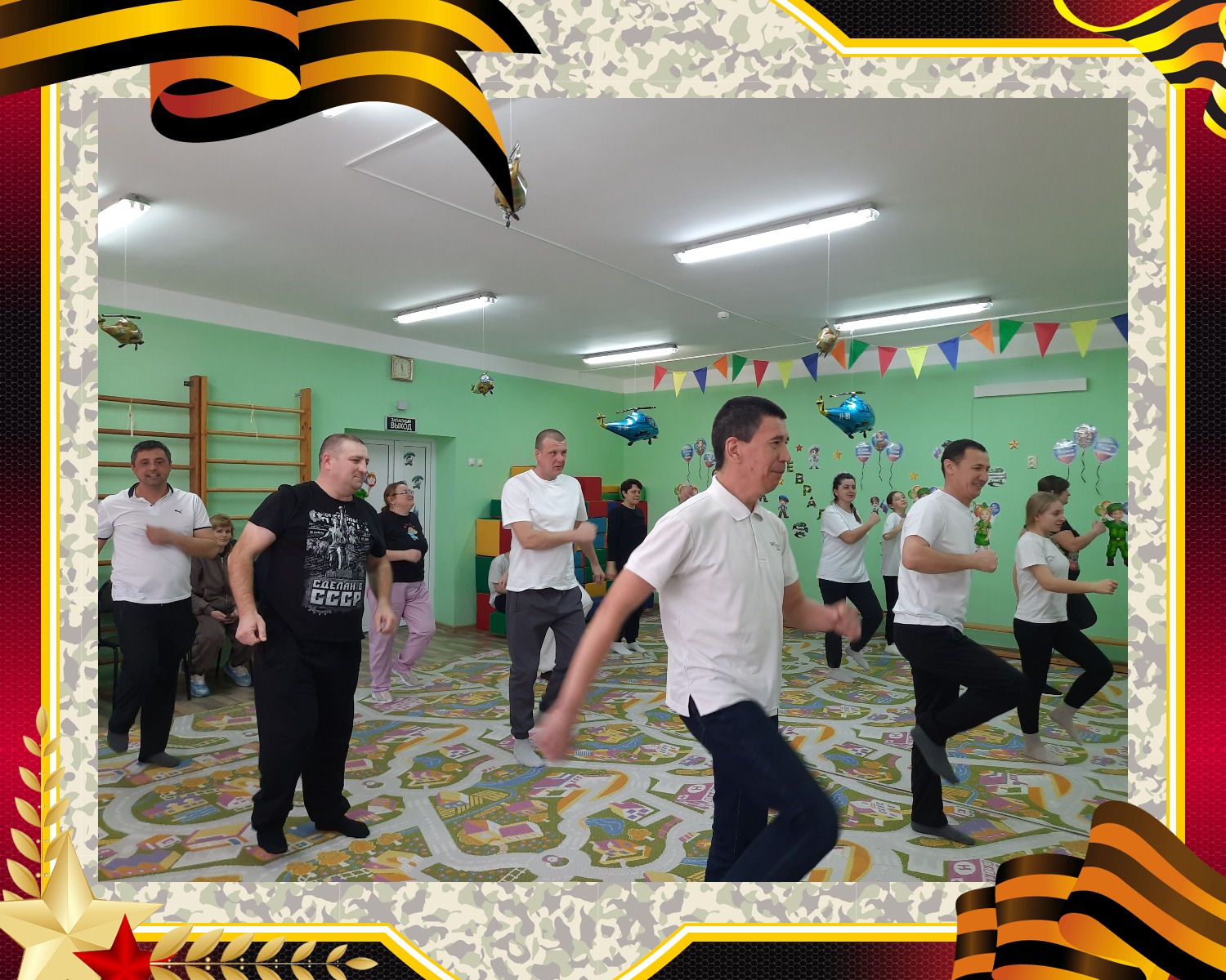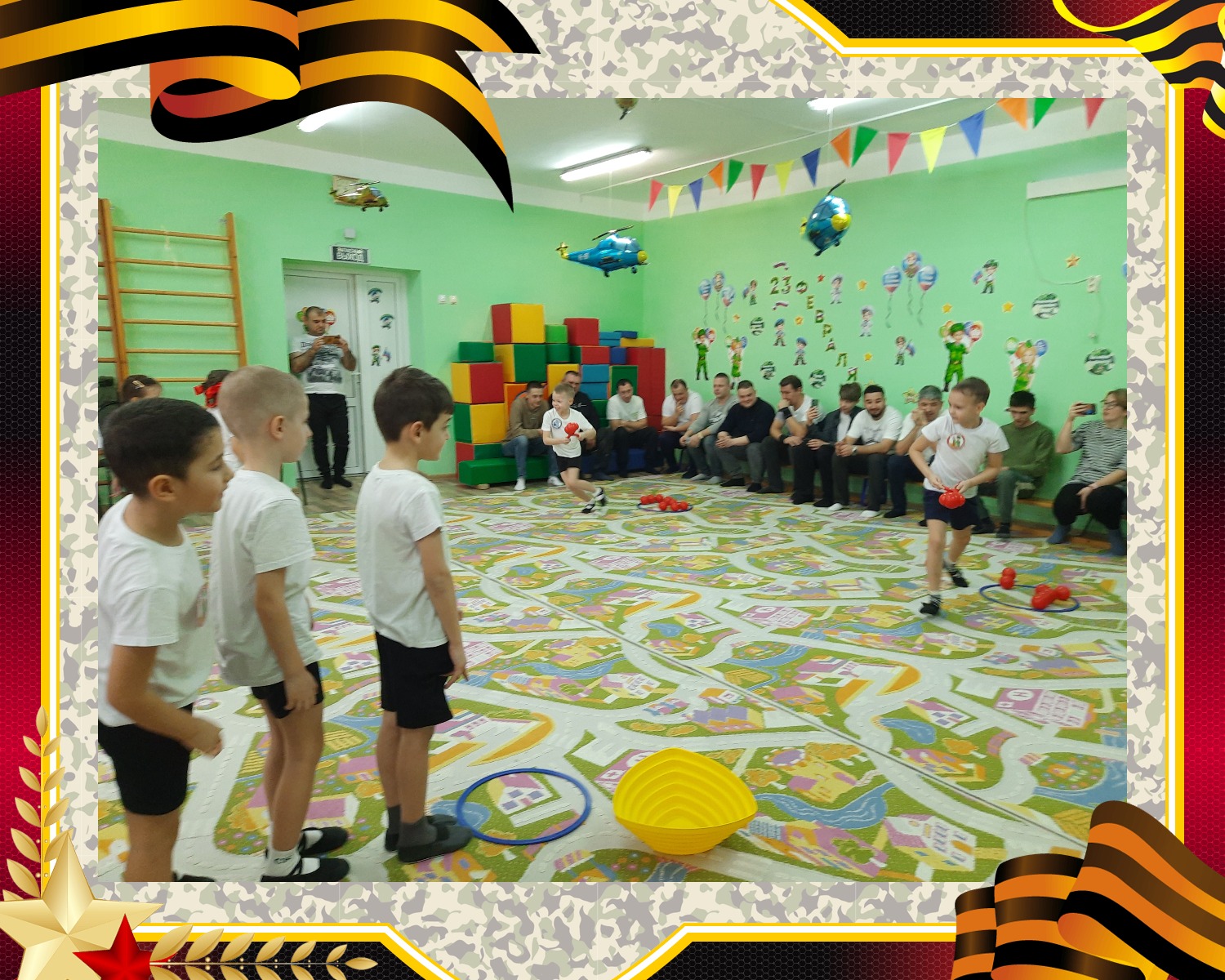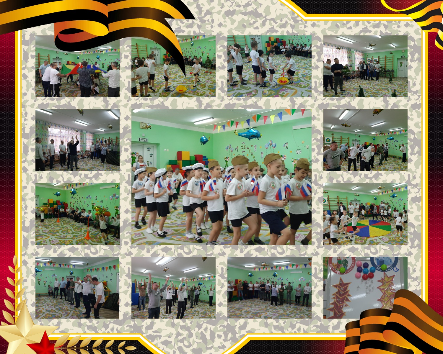 Ведущая объявила о начале «Военных учений», и ребята разделились на две команды: «Пограничники» и «Моряки». Команды представили свои названия и звонкие девизы. Но какой солдат идет в бой без подготовки? Праздник открыла задорная разминка «Солдатом тоже стану я», к которой с удовольствием присоединились и папы.
