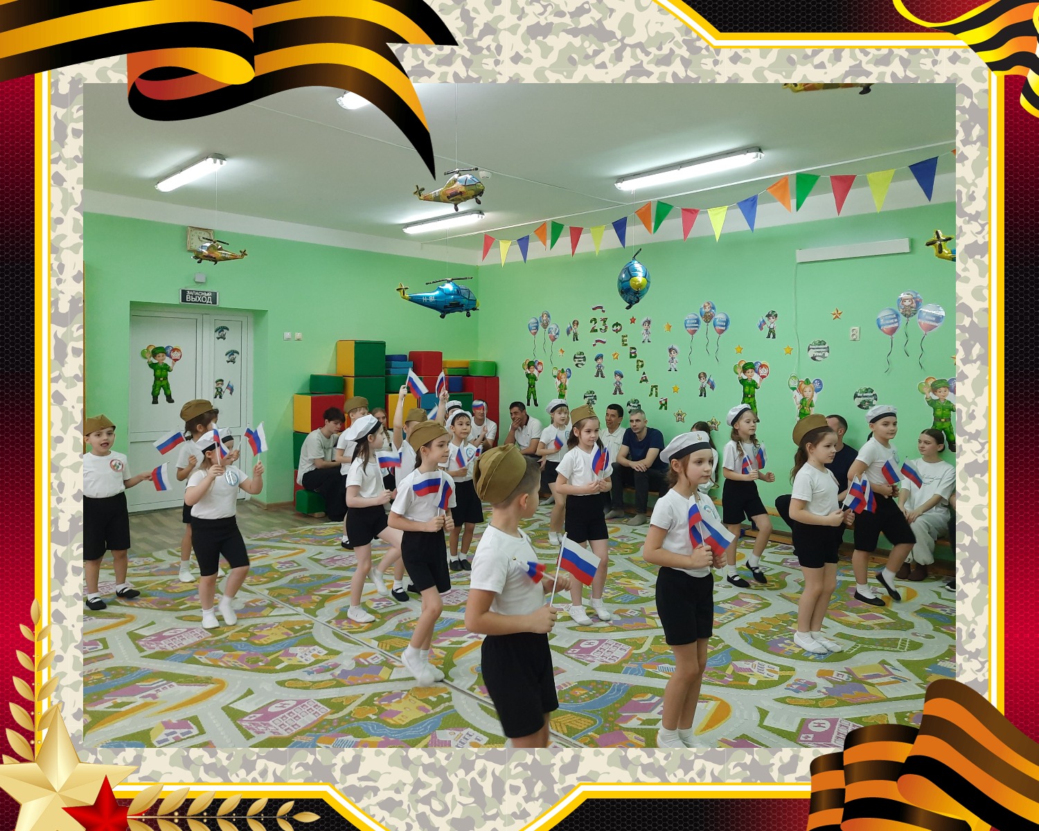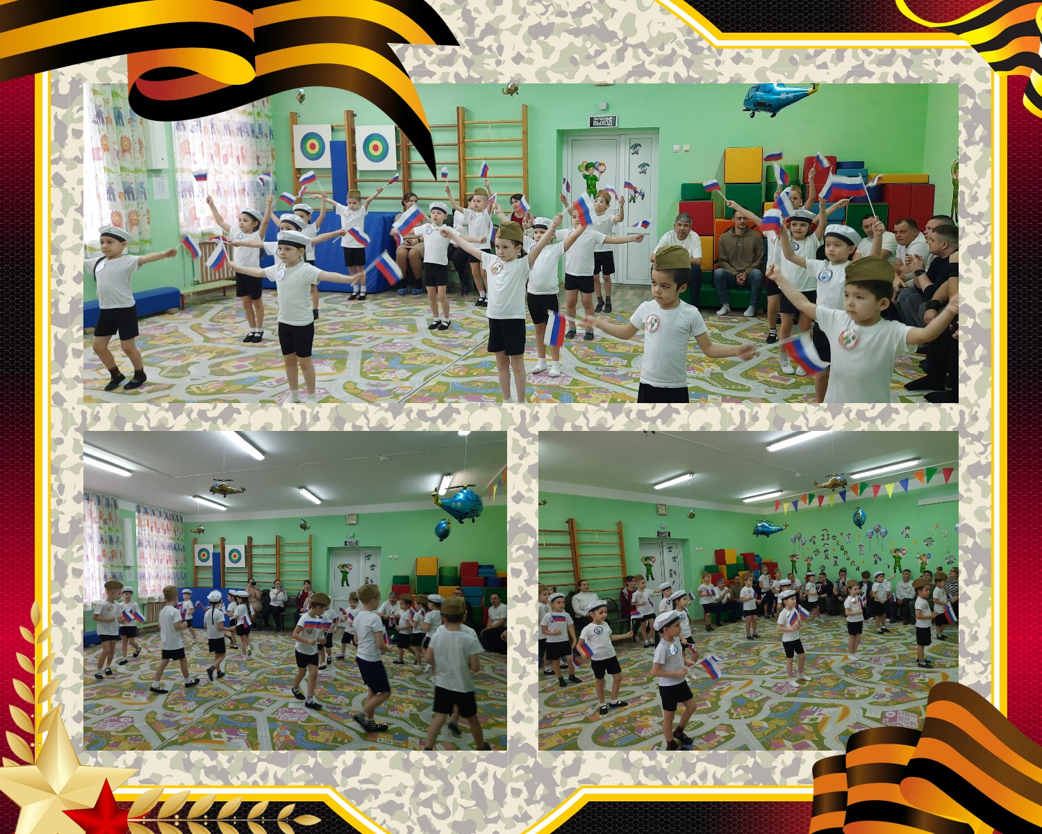 Праздник начался очень торжественно: под звуки бодрого марша дети вошли в зал с российскими флажками. Четкие перестроения и выразительное чтение стихов сразу задали патриотический настрой и создали атмосферу настоящего военного парада.