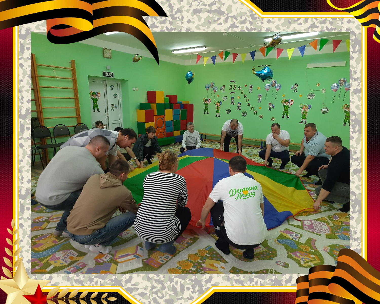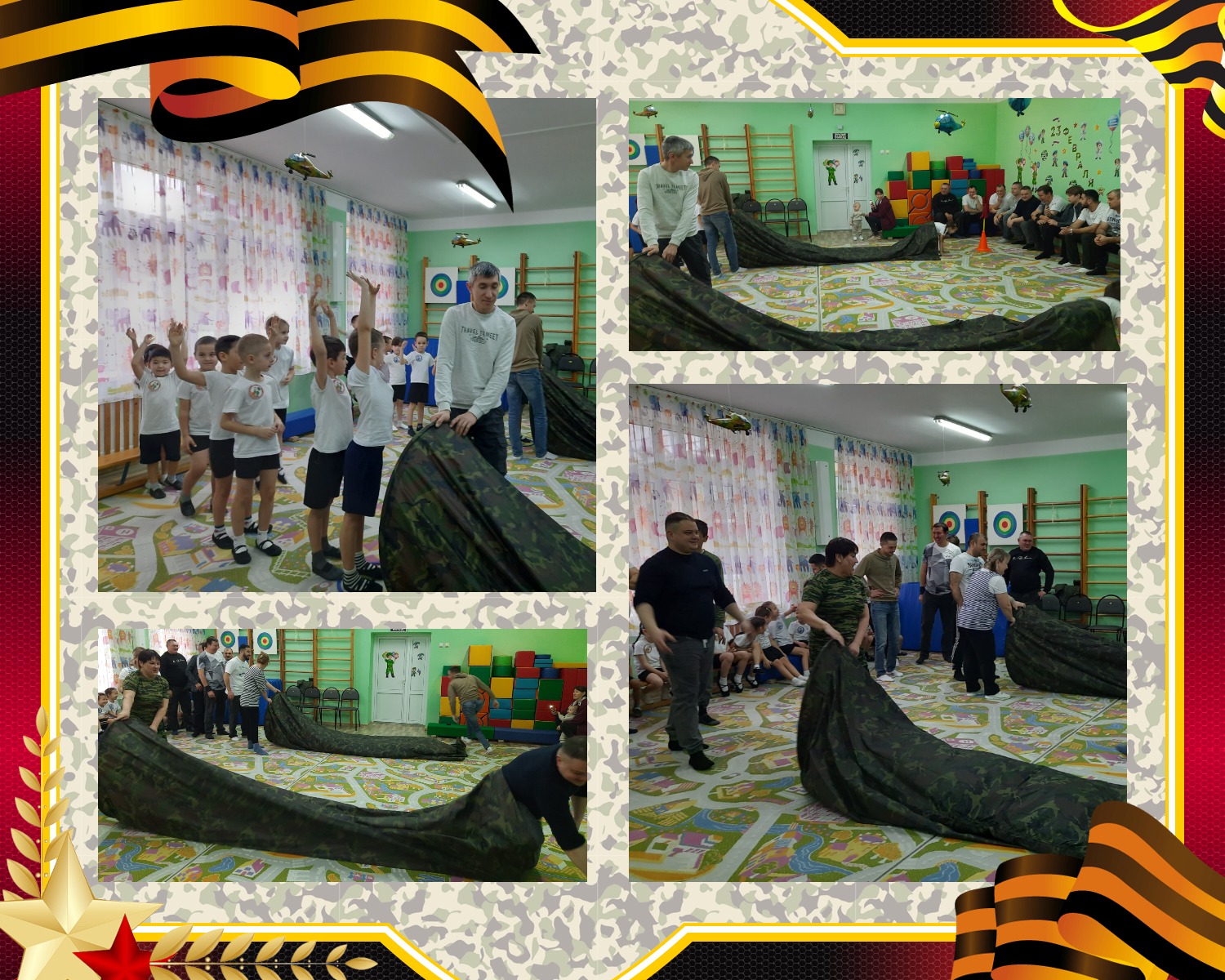 В игре «Маскировка» ребята должны были проявить максимальную быстроту: по сигналу «вражеской разведки» нужно было мгновенно скрыться под огромным ярким куполом парашюта. Папы активно помогали своим бойцам стать «невидимыми».