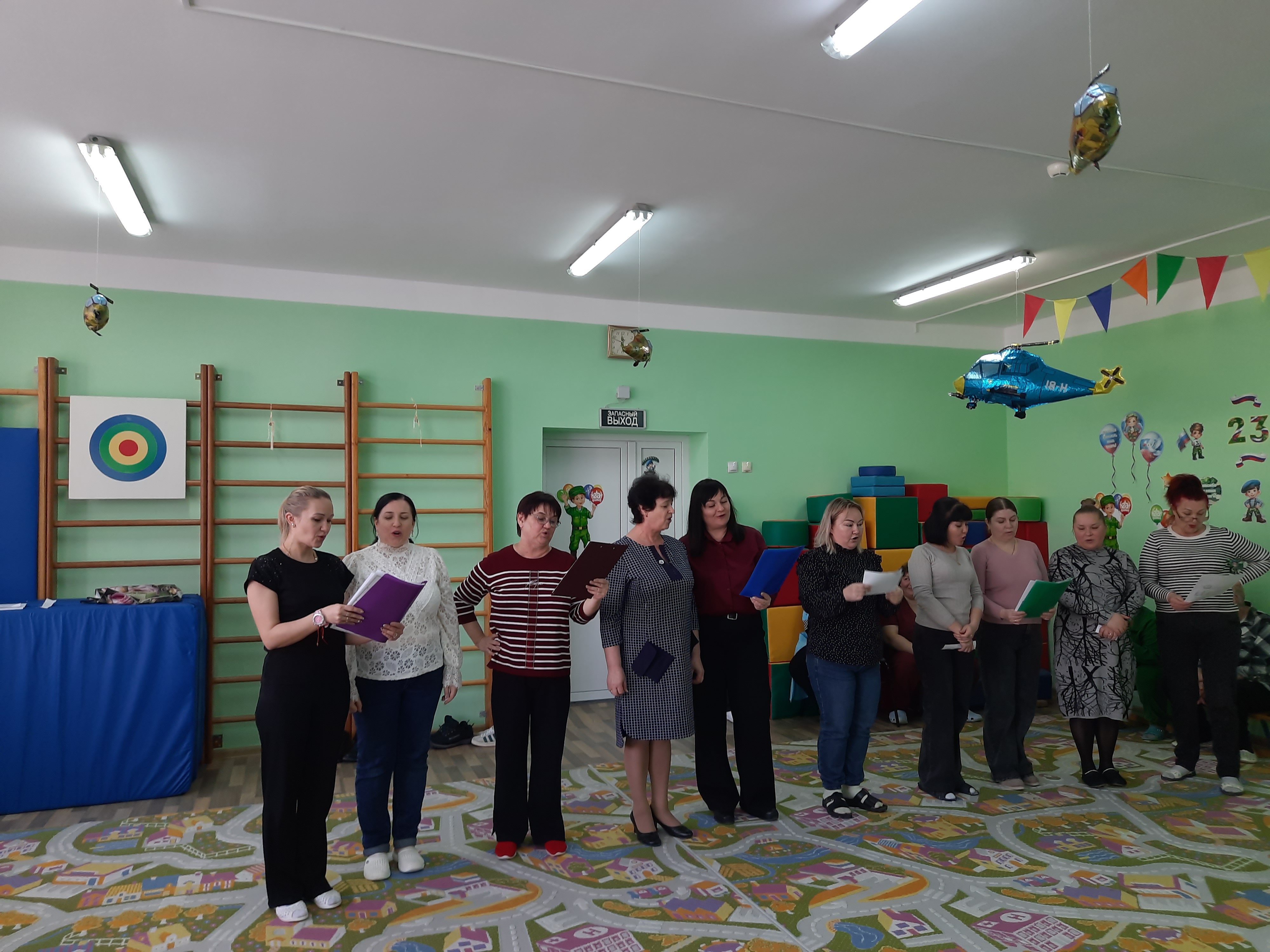- шуточный номер от сотрудников детского сада, созданный для поднятия настроения и вызвавший улыбки у всех присутствующих и песня-поздравление, которая стала музыкальным подарком для мужчин.
