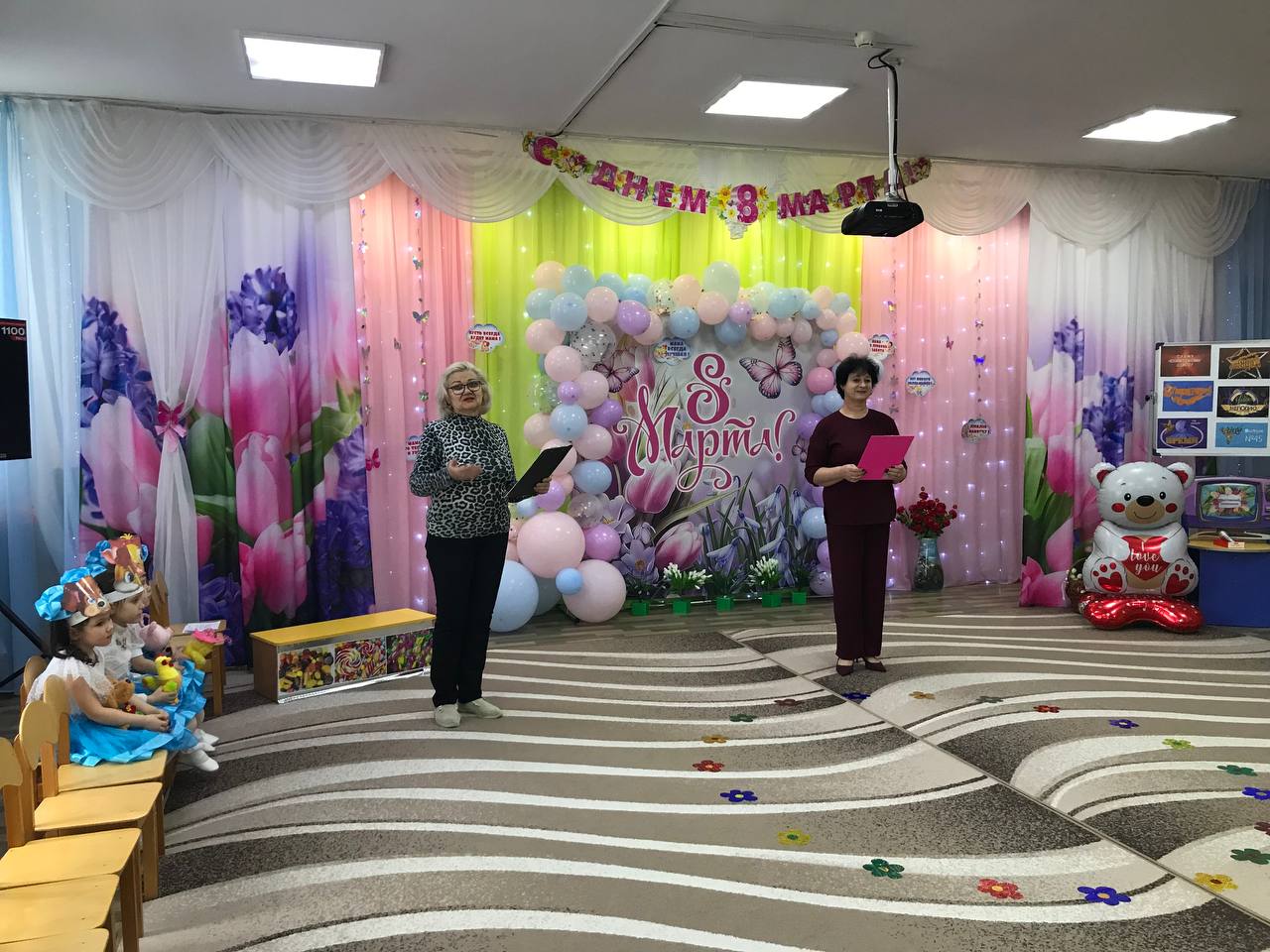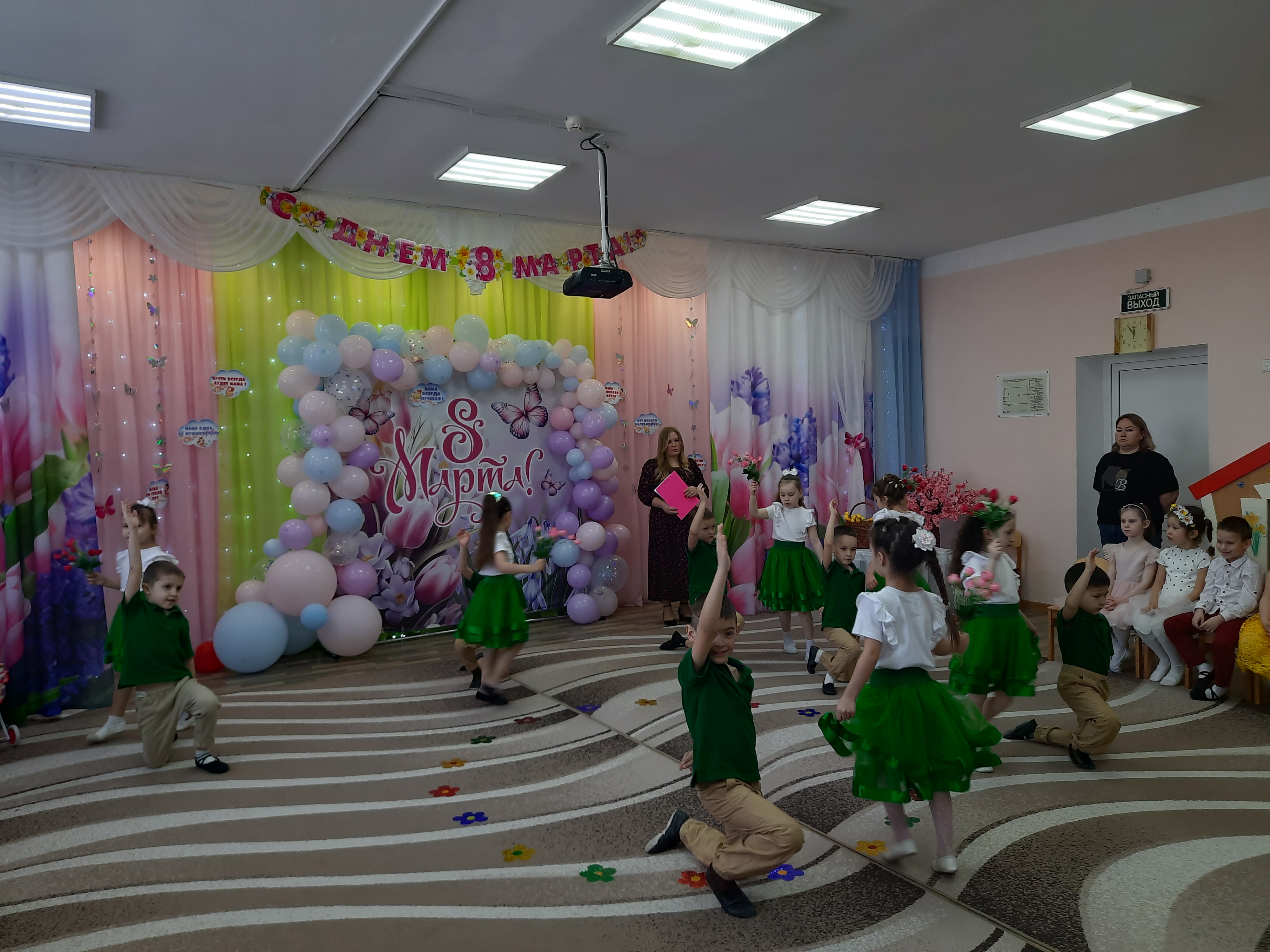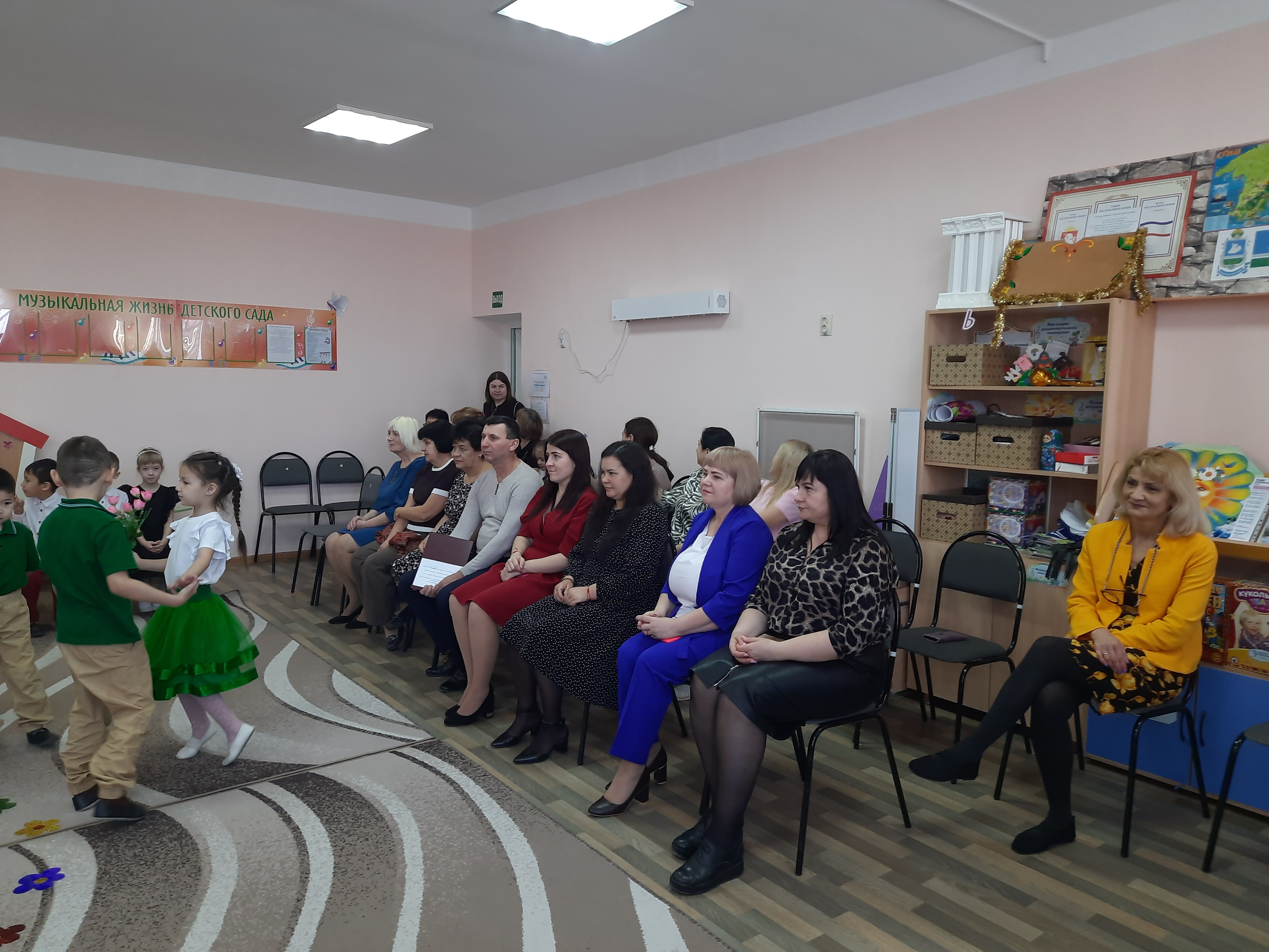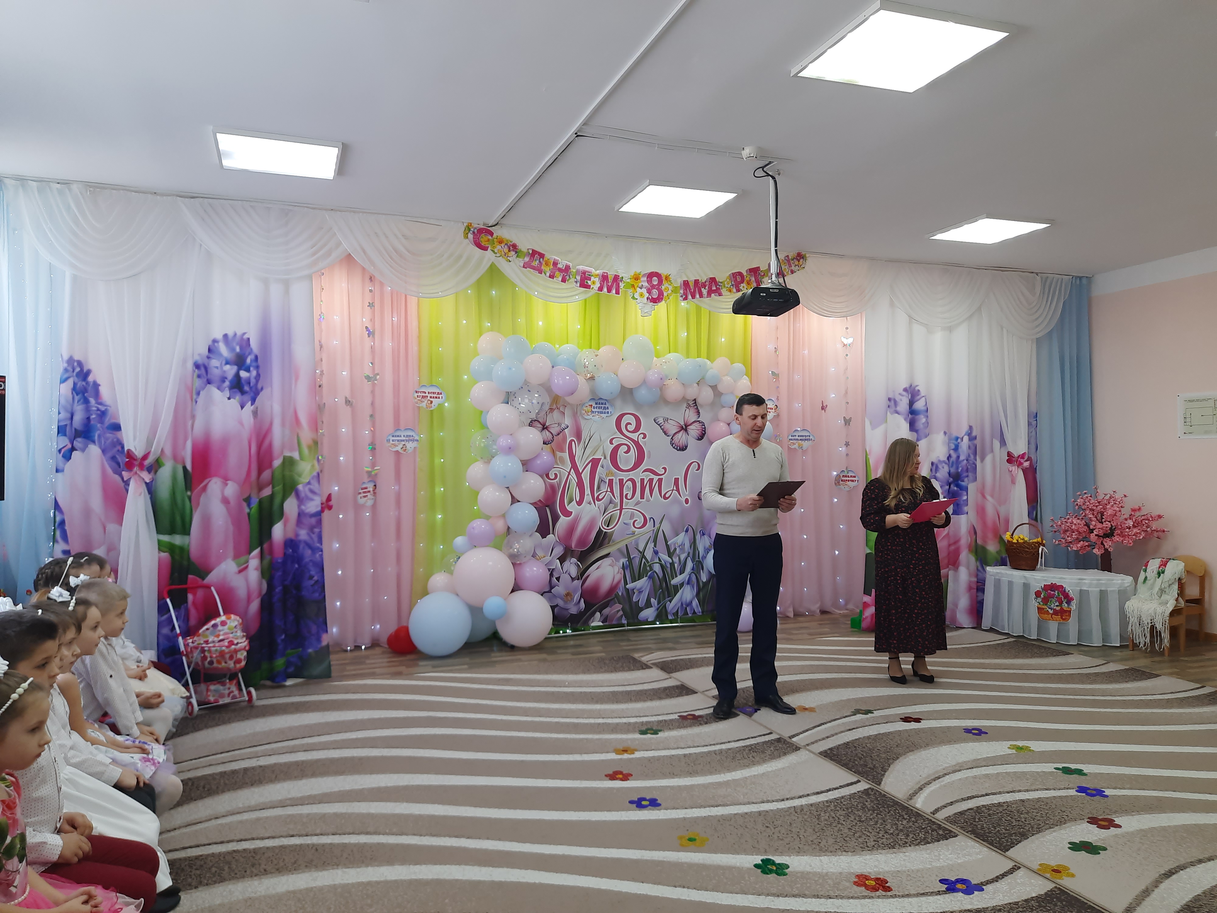 В зале собрались все: воспитатели, помощники воспитателей, повара, медицинские работники, прачки и администрация сада. Для них ребята подготовили свои самые лучшие номера.